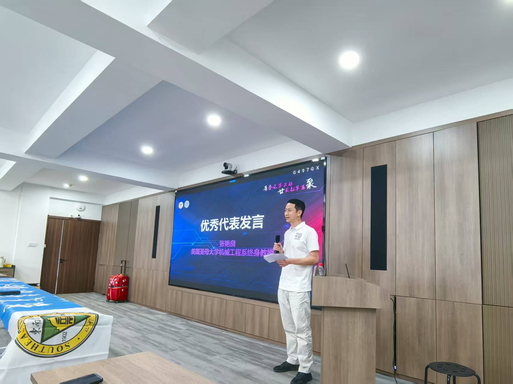 随后,优秀员工代表、美国圣母大学机械工程系终身教授张艳良上台发言。他满怀深情地追忆了2001年初入浦口校区、020015班集体成立的那一刻,那些关于青春、关于梦想、关于友谊的美好回忆如潮水般涌上心头,令人感慨万千。张教授的演讲情真意切,字字句句都触动着在场每一位员工的心弦,他的话语如同春风拂面,温暖着每一个人的心田,让人心生共鸣。