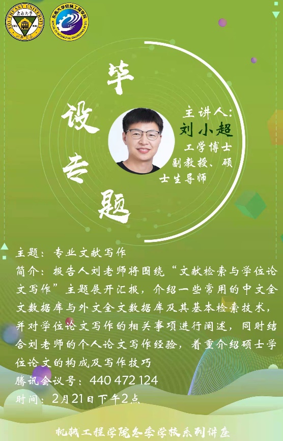 2月21日下午,毕业设计专题指导讲座第二场开讲,由bv1946伟德官网副教授、硕士生导师刘小超老师带来内容为文献检索和学位论文习作的分享。刘老师首先详细地介绍了中英文全文数据库检索,包括数据库的定义、类型以及检索的逻辑等,很大程度上帮助同学们缩小了检索范围,提高检索的效率。此外,刘老师以自己的本科和硕士毕设论文为例,结合自己的亲身体会,按照论文框架结构,为同学们详细介绍了学士学位论文写作的规范和写作技巧。讲座的最后,刘老师期望同学们重视本科毕业设计,认真做好每一项工作,为以后的科学研究打下良好的基础。