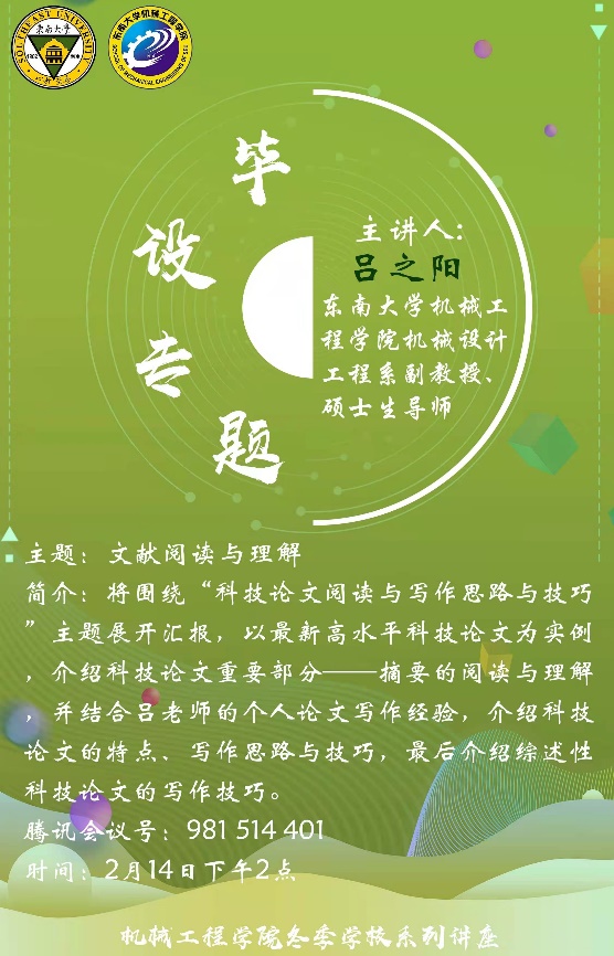 2月14日下午,毕业设计专题首场线上首场讲座开讲,由bv1946伟德官网副教授、硕士生导师吕之阳老师围绕“科技论文阅读与写作思路与技巧”主题展开讲解。吕老师以最新高水平科技论文为实例,介绍科技论文重要部分——摘要的阅读理解,并结合吕老师的个人协作经验,介绍科技论文的特点、写作思路与技巧,并对综述性科技论文的写作技巧进行了详细阐述。在讲座的最后,吕老师针对同学们的问题发表了自己独特的见解,同学们收获颇丰。